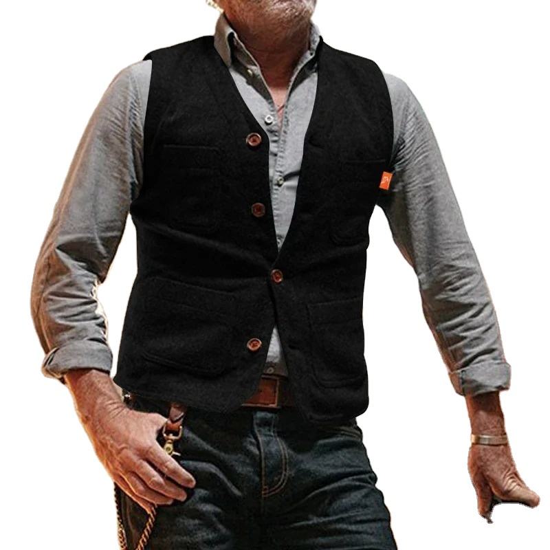 Men's V-Neck Wool Suit Vest Single-Breasted with Solid Color High Quality Top for Spring Autumn and Winter