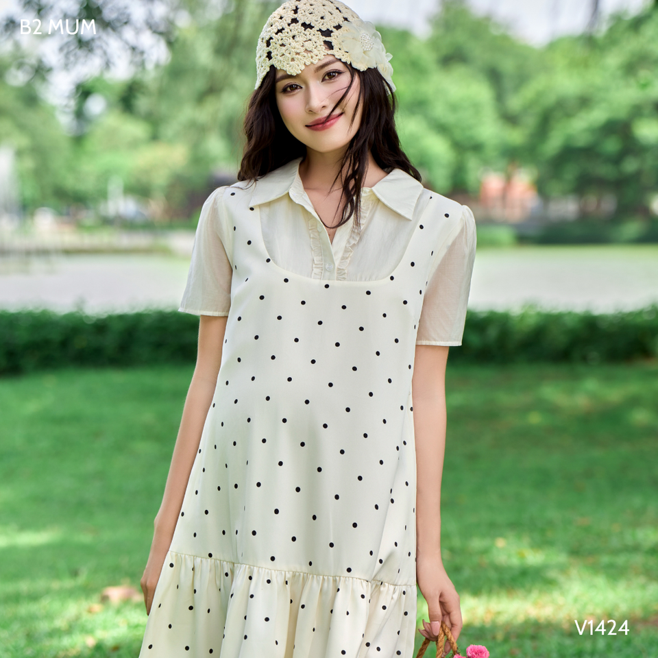 V1424 Fishtail Polka Dot Maternity Dress Soft Cool Sweat-Absorbent Fabric Side Pockets Adjustable Elastic Buttons for Pregnant