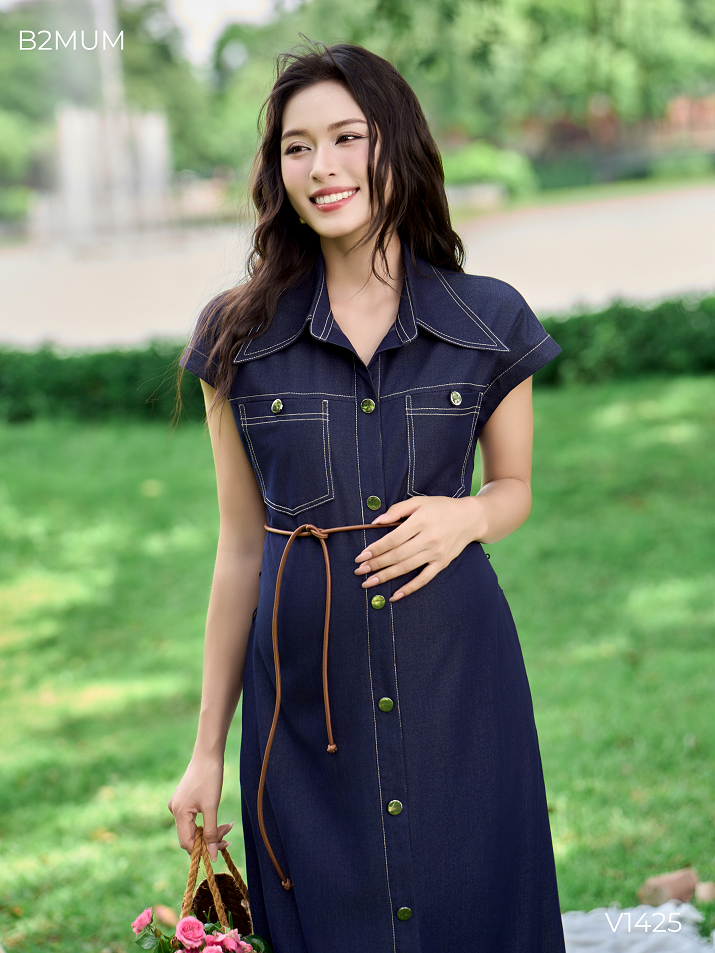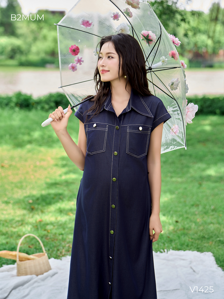 V1425 Denim dress for pregnant women soft cool sweat-absorbent silk denim 2 chest pockets side pockets