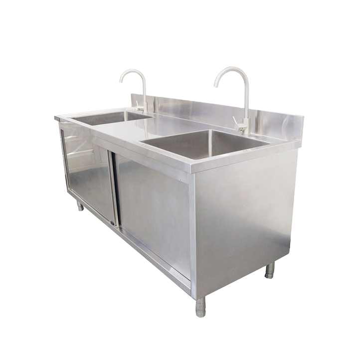 VICTORY KITCHEN Industrial Double Bowl Stainless Steel 201/304 Kitchen Sink Work Table on Cabinet Sliding Door Restaurant