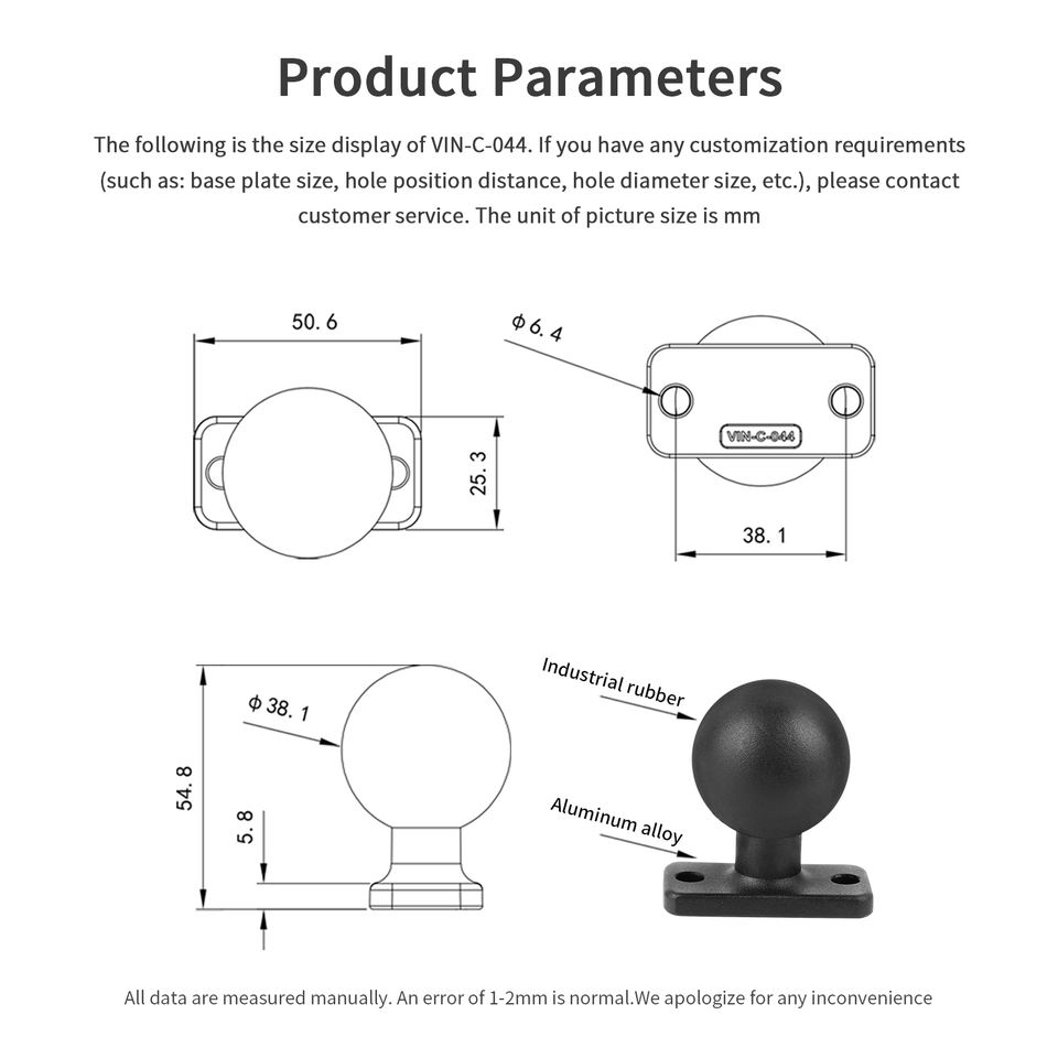 VIN 1.5" Ball Mount with 38.1mm/1.5" 2-Hole Pattern C size for Driving Recorder Monitors VIN-C-044
