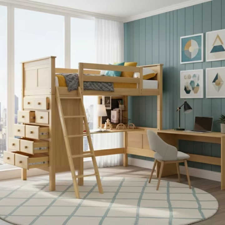 Valencia Twin Loft Bed with Dressers Modern Design Best Price Natural Color New Zealand Pine Wooden Beds Made in Vietnam