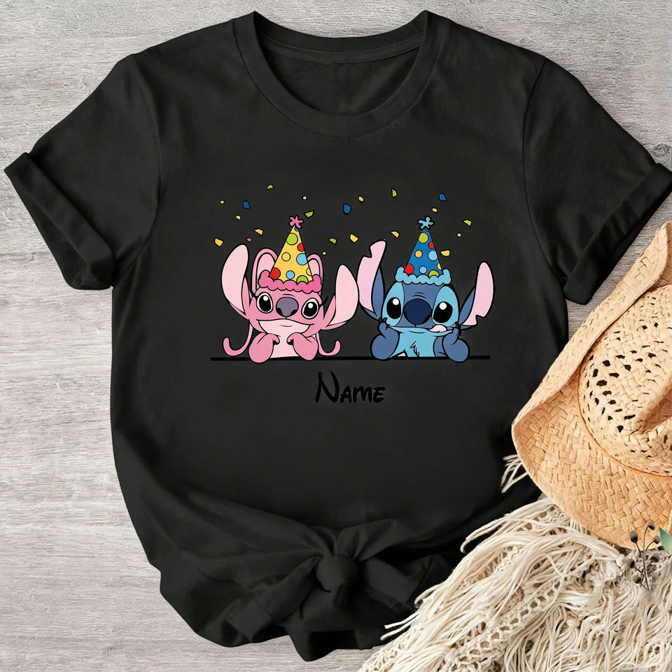 Valentine Matching Lilo and Stitch Couple T Shirt Stitch and Angel in Party Hats with Colorful Confetti White Cotton Sport Tee