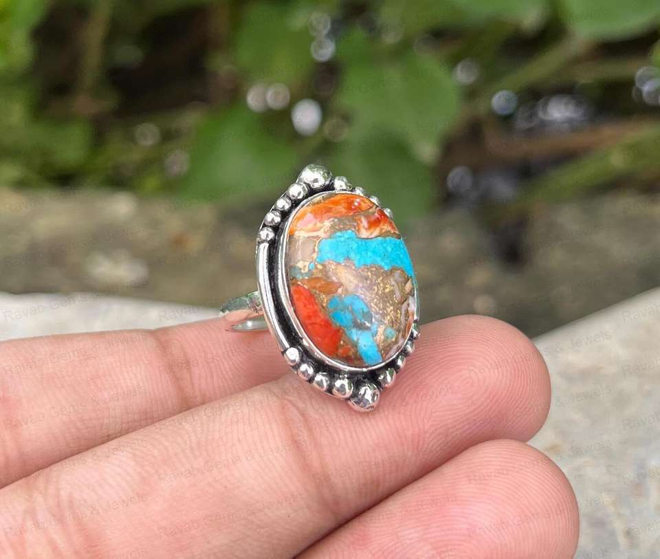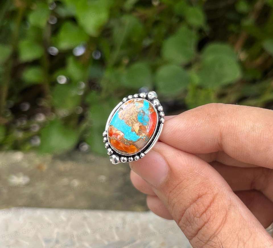 Valentine Sale Natural Multi Color Spiny Oyster Turquoise Oval 10x14mm Solid 925 Sterling Silver Beaded Fine Ring for Womens