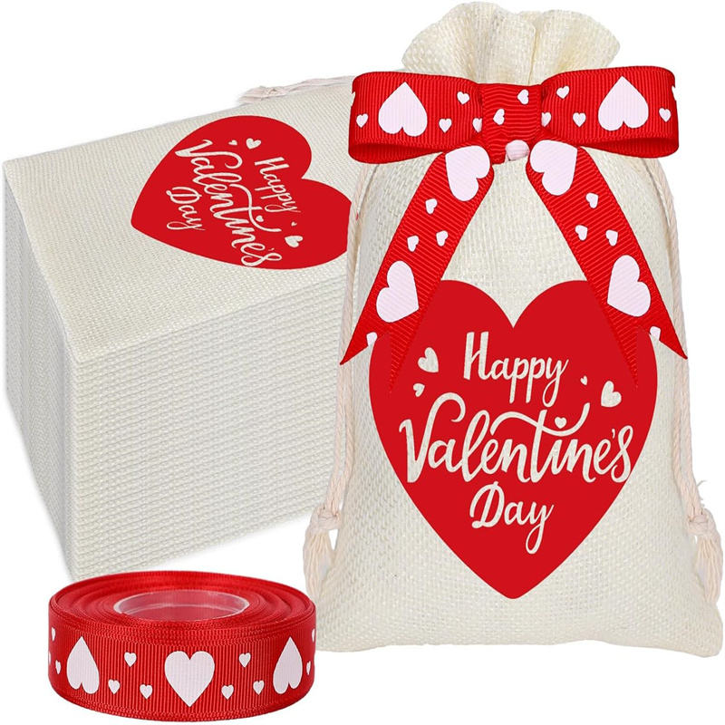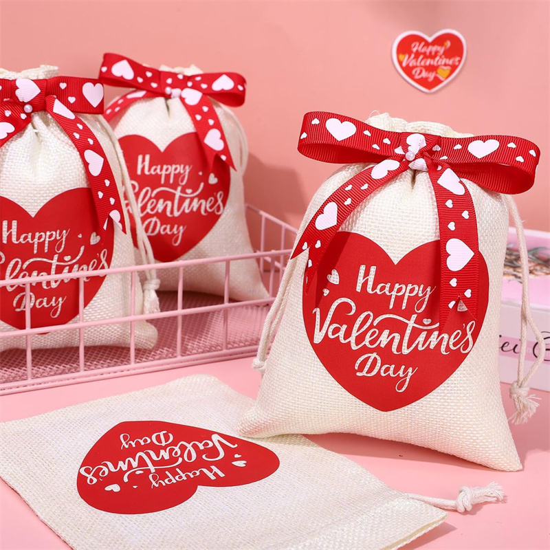 Valentine's Day 13*18cm Recyclable Burlap Gift Bags Red Heart Pattern Drawstring Candy Pouches Silk Ribbon Jute Linen Rustic