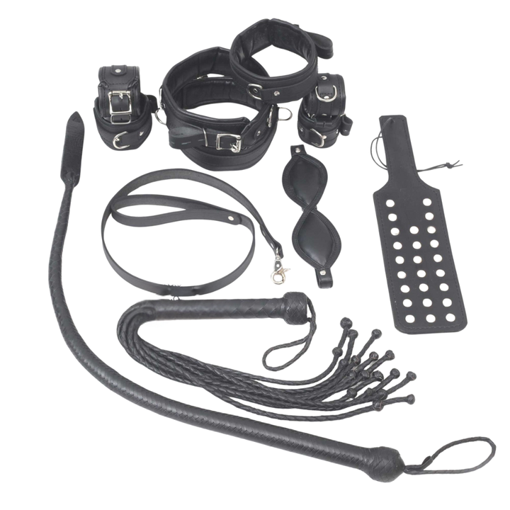 Valentines Role Play Bondage Set with Leather Cuffs Collar Paddle and Sensory Gear