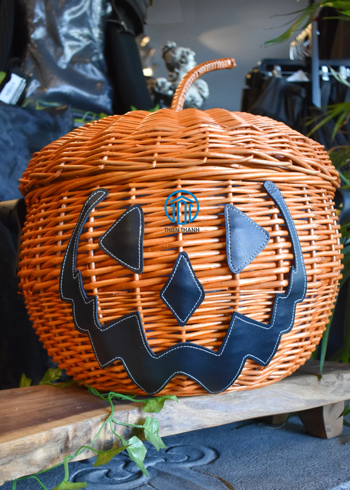 Vegan-friendly Halloween Picnic Basket Pumbkin Halloween Bags Wicker Basket Round Shaped Lid with Stem