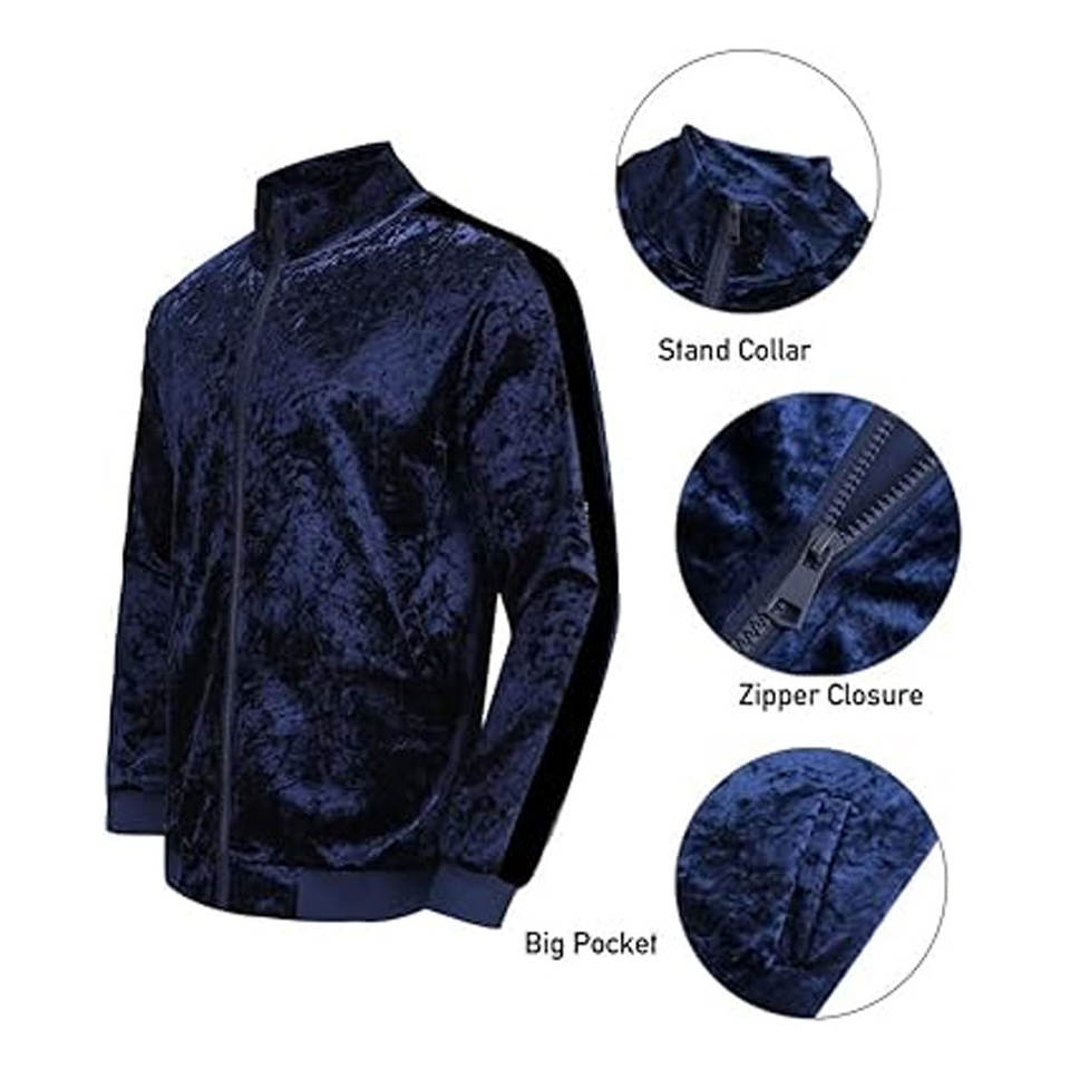 Velour Winter Casual Solid Printed Tracksuit Zip-Up Hooded Crop Jacket Pants with Pockets Men's