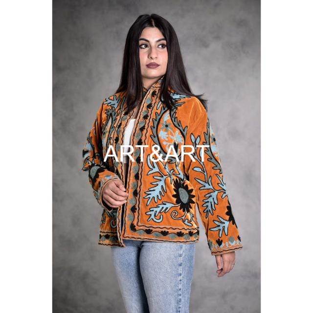 Velvet Cotton Quilted Short Breathable Argyle Suzani Embroidery Women's Coat with Raw Edge and TNT Fabric