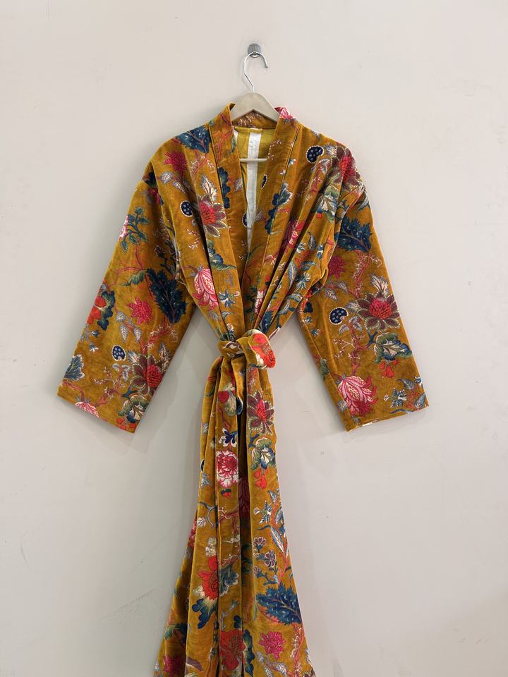 Velvet Kimono Robe For Women Handmade Cotton Velvet Long Dressing Gown Lounge Wear Jacket