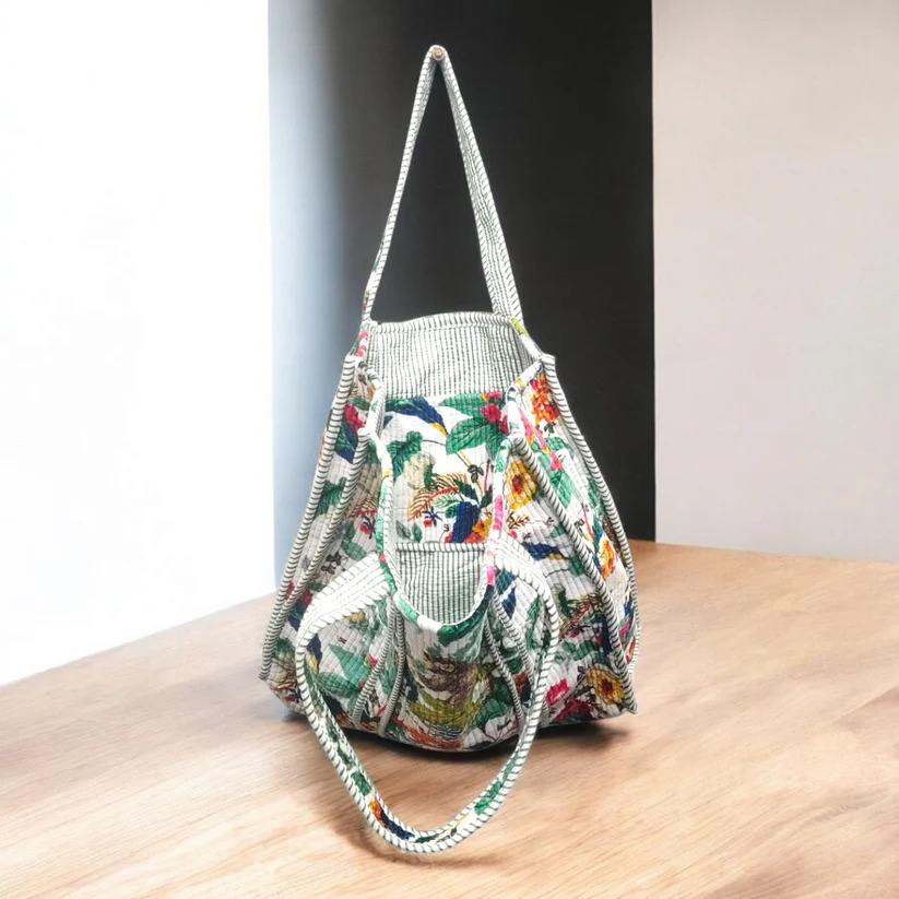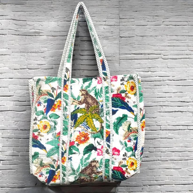 Velvet Quilted Vintage Bohemian Tote Bag with Zipper Closure-Monkey Print Navy Blue Lady Fashion