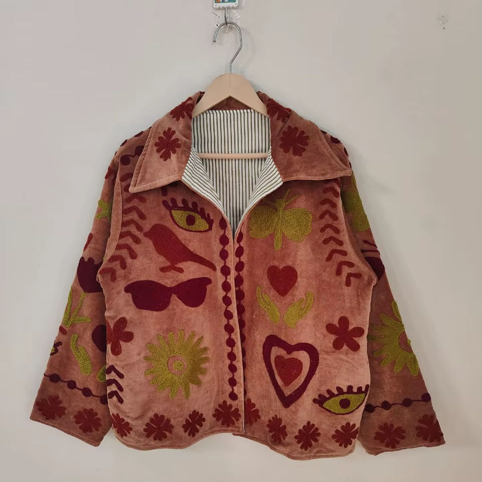 Velvet Suzani Jacket Boho Embroidered Eye & Heart Motif Coat Handmade Colorful Festival Wear Unique Artistic Statement Jacket