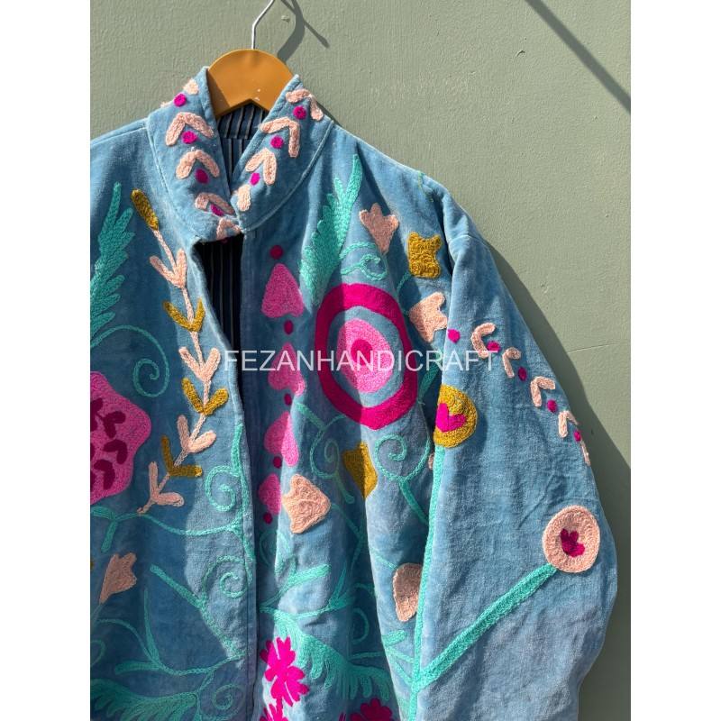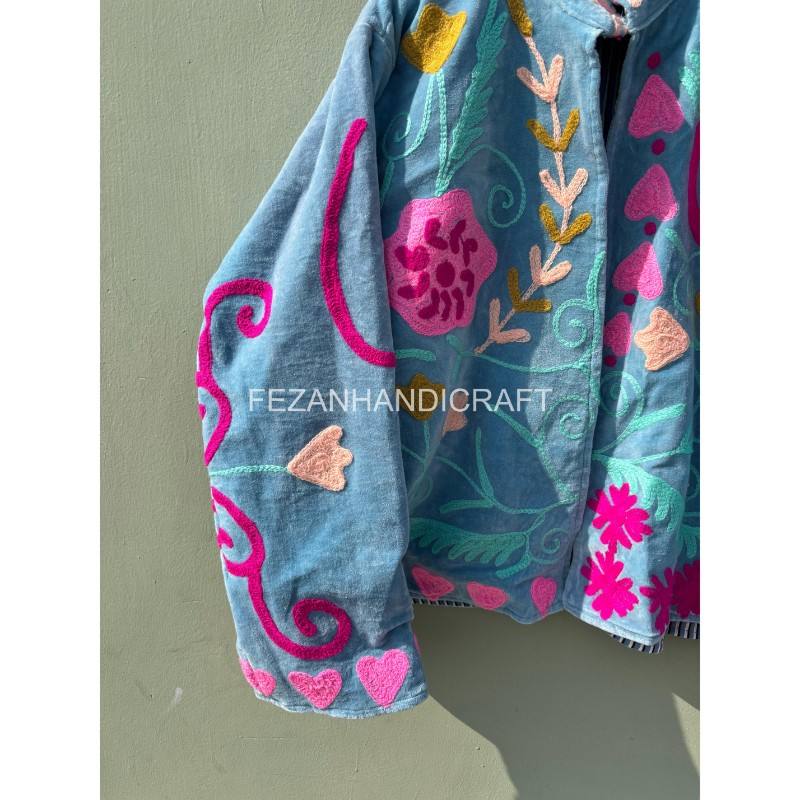 Velvet Suzani Quilted Jacket Floral Embroidery Knitted Stand Collar Regular Unisex Spring Autumn Party Wear Women's MOQ Pieces