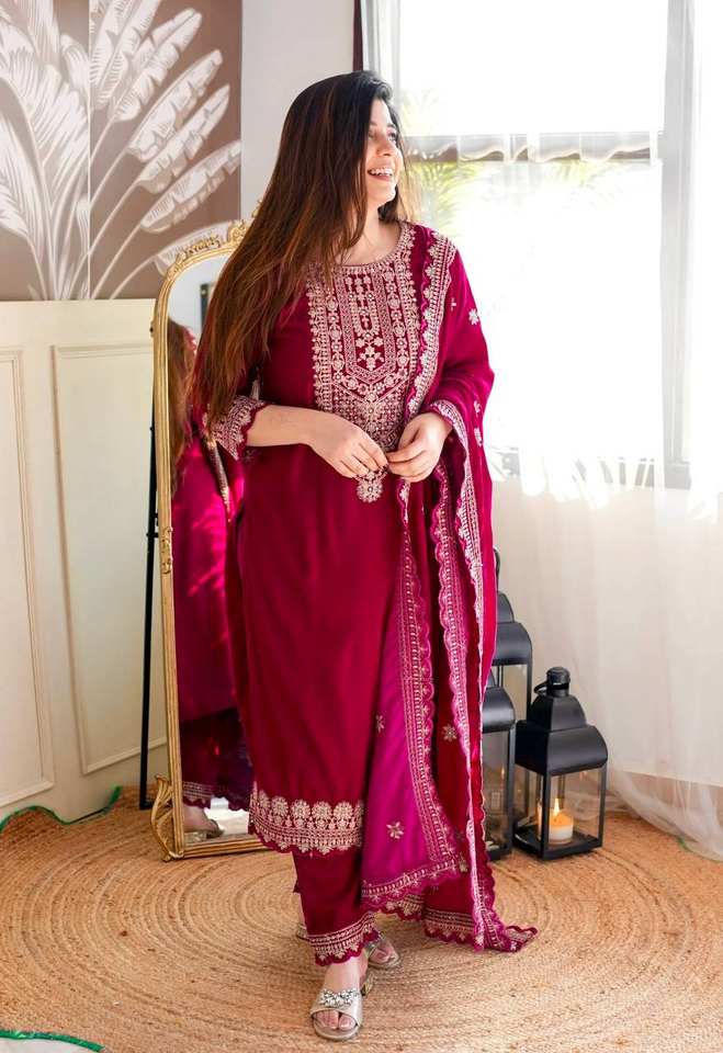 Velvet Top with Heavy Embroidery Work Pent Salwar Kameez Formal Style Moisture Wicking Made of Viscose for Party Occasions