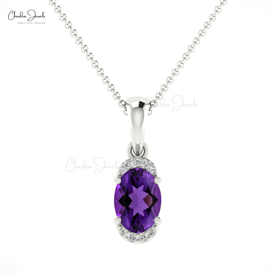 Verified Supplier Handmade 14k Solid White Gold Natural 7x5mm Oval Cut Amethyst & 0.9mm G-H Diamond Half Halo Pendant Gift
