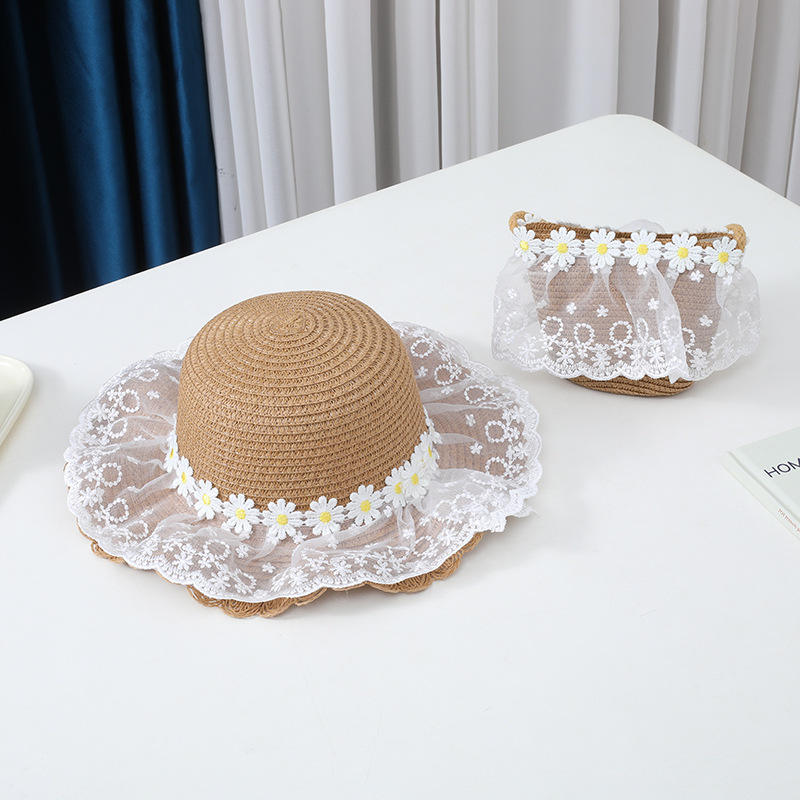 Versatile Lace Straw Visor Cap Baby Hat + Bag Set for Children's Summer Outdoor Leisure