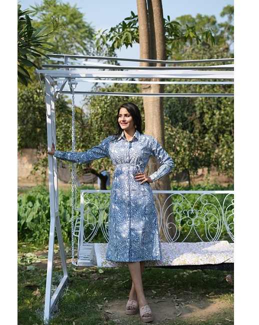 Versatile Women's Classic Sky Blue Woven Cotton Empire Waist Long Sleeve Vintage Dress Eco-Friendly Washable for All Events