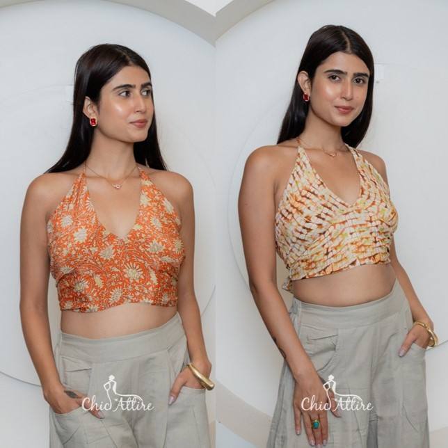 2025 Dual Reversible Floral Halter Neck Cotton Crop Top For Women Boho Double Sided Back Tie Sleeveless Summer Orange White Tops