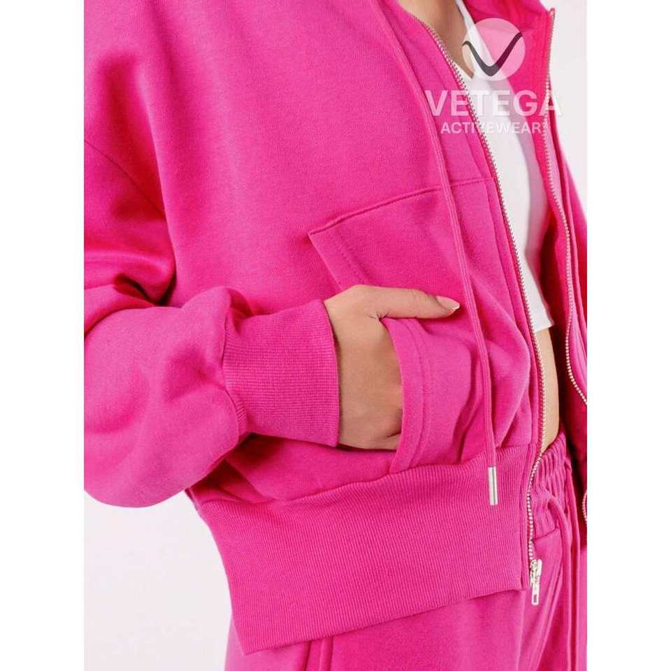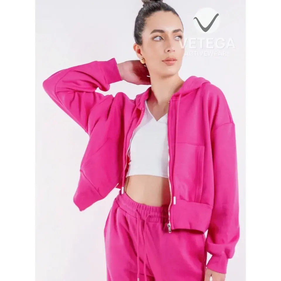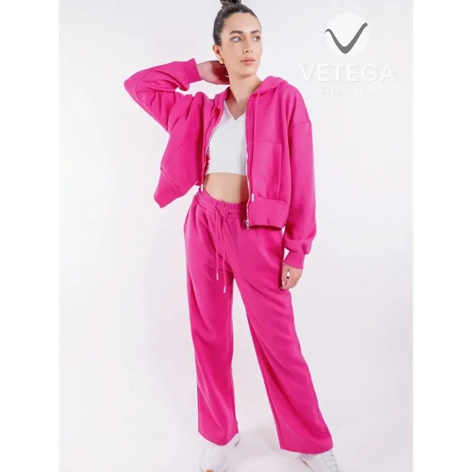 Vetega Women's Rosa Solid Color Round Neck Stretch Zipper Hoodie Sweatshirt and Pants Sports Set with Pockets and Loose Fit