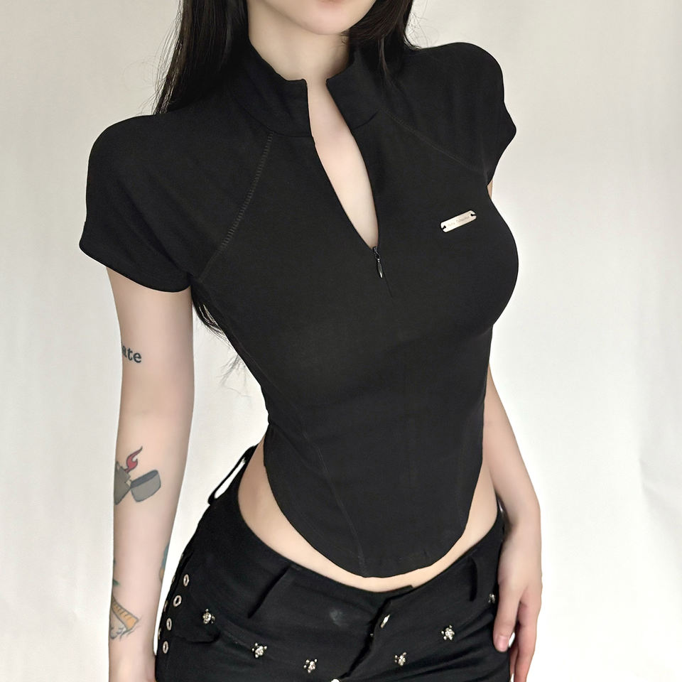 Vetements femme Y2K Gothic Style Invisible Zipper Stand Collar Contrast Stitching Paneled Slim-Fit Cropped Short-Sleeve T-Shirt