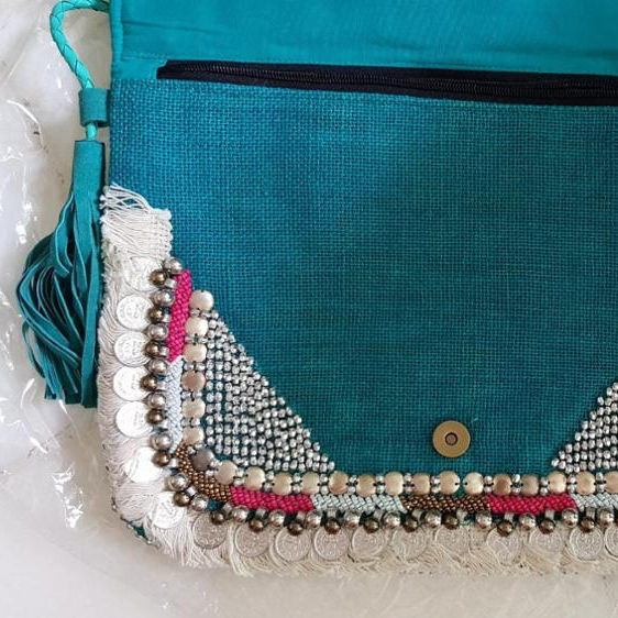 Vibrant Blue Silk Clutch Purse with Coin and Fringe Detail Elegant Leopard Pattern Beaded and Sparkling Detail PU Lining