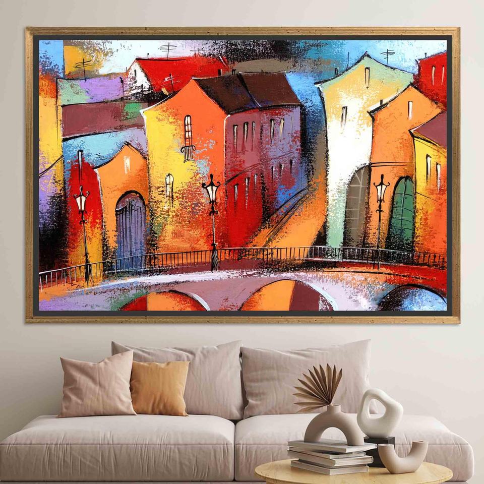 Vibrant City View Printed Canvas: Modern Stained Glass Style Art,GOLD FRAMED CANVAS