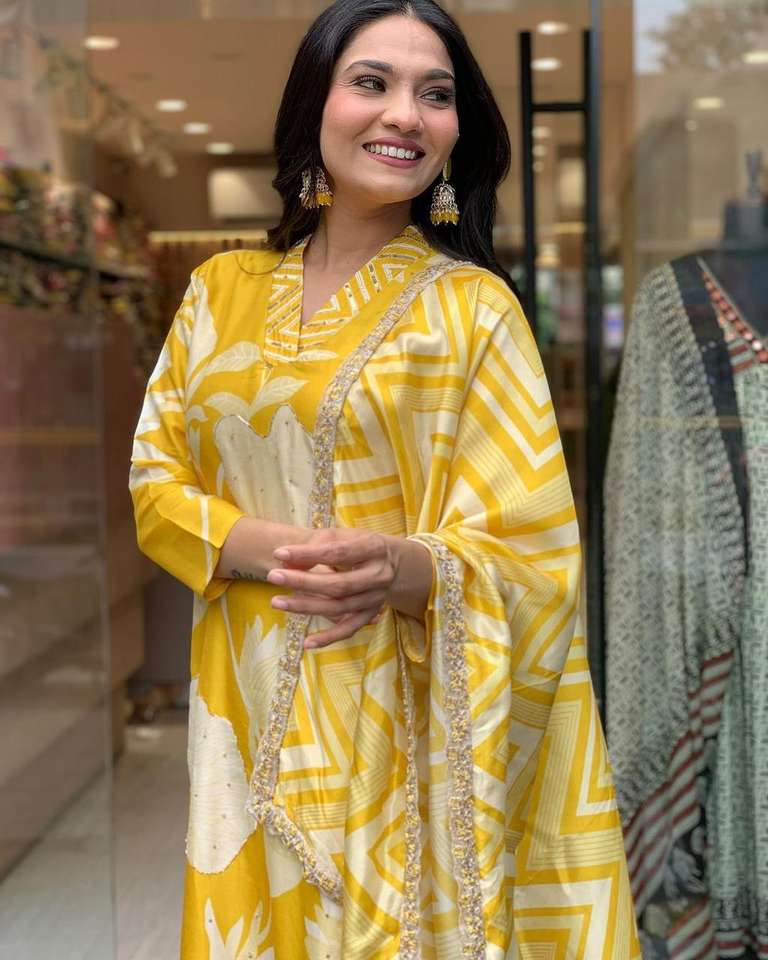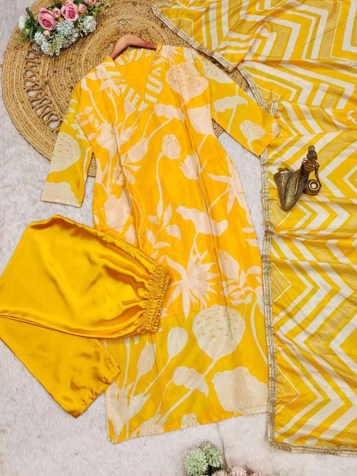 Vibrant Traditional Indian Floral Print Kurta with Chinnon Fabric Dupatta for Party Wear in White and Yellow Shades