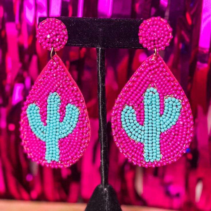 Vibrant Fuchsia Pink Floral Drop Earrings Green Leaf Detail Aesthetic Statement Jewelry Embroidery Crafts Needlework