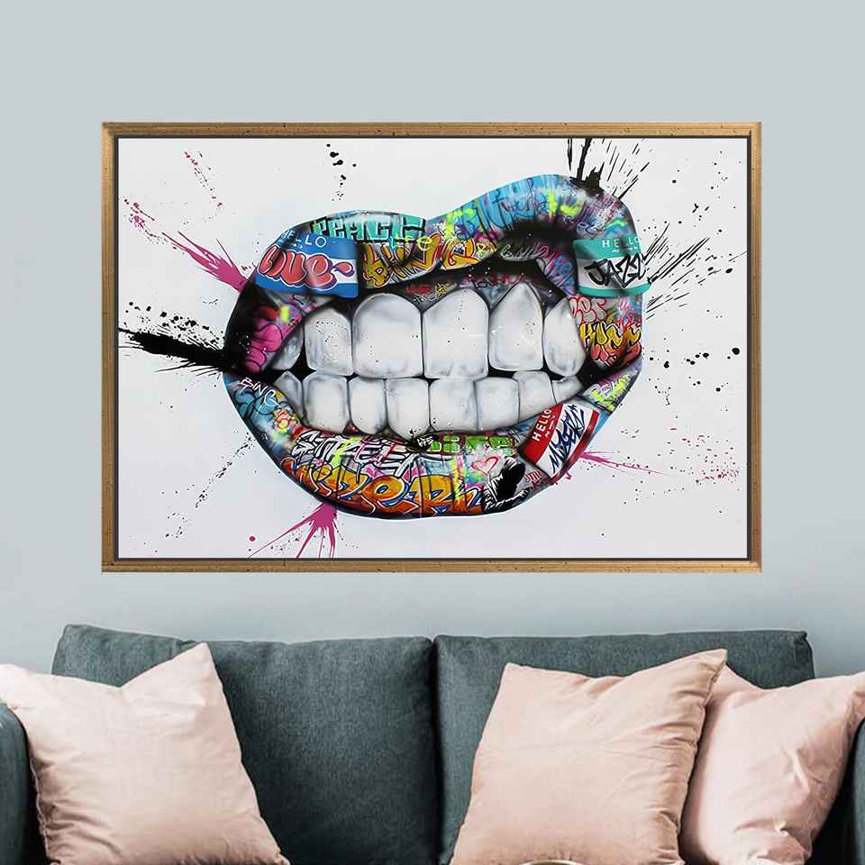 Vibrant Graffiti Lips Printed Canvas Art - Urban Street Pop Decor,1P:Gold Framed