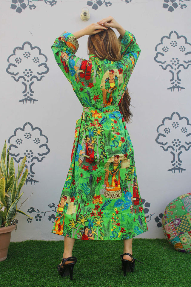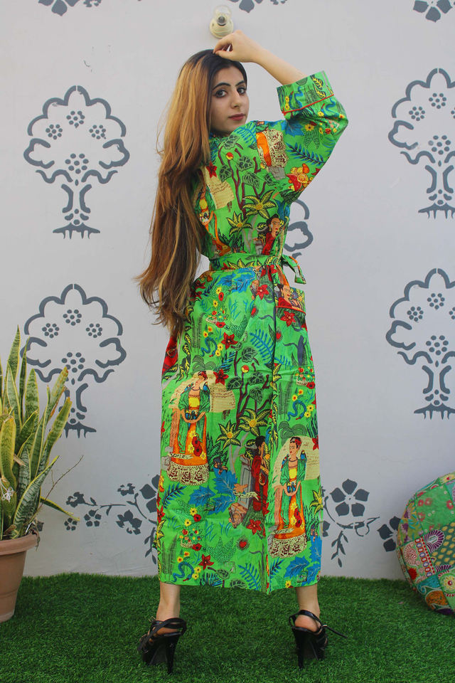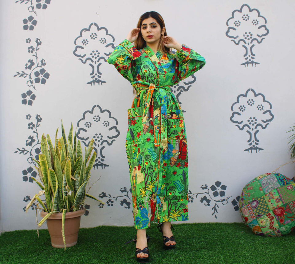 Vibrant Green Tropical 100% Indian Handcrafted Cotton Casual Kimono Robe Screen Printed with Slits Waist Tie Pockets Kimono Robe
