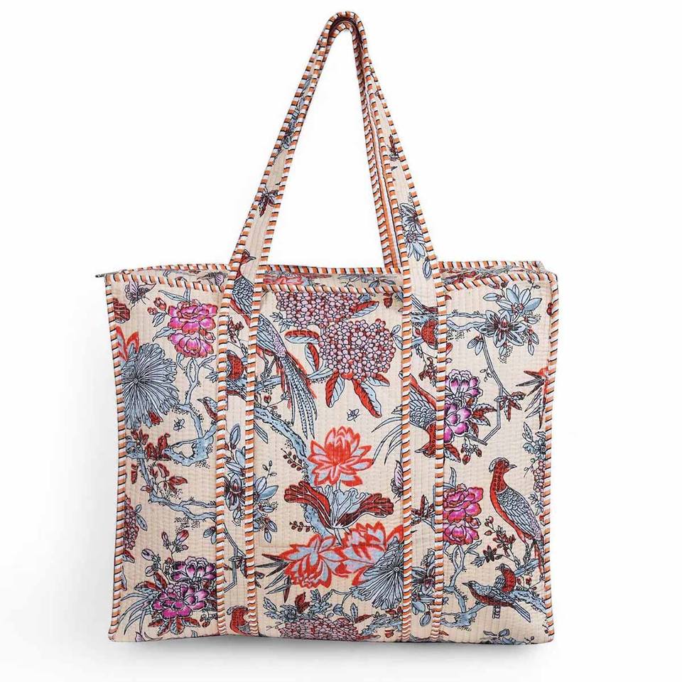 Vibrant Orange Quilted Cotton Tote Bag Hand Block Floral Print Summer Beach Tote Quilted Reversible Large Tote Bags