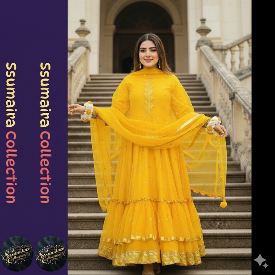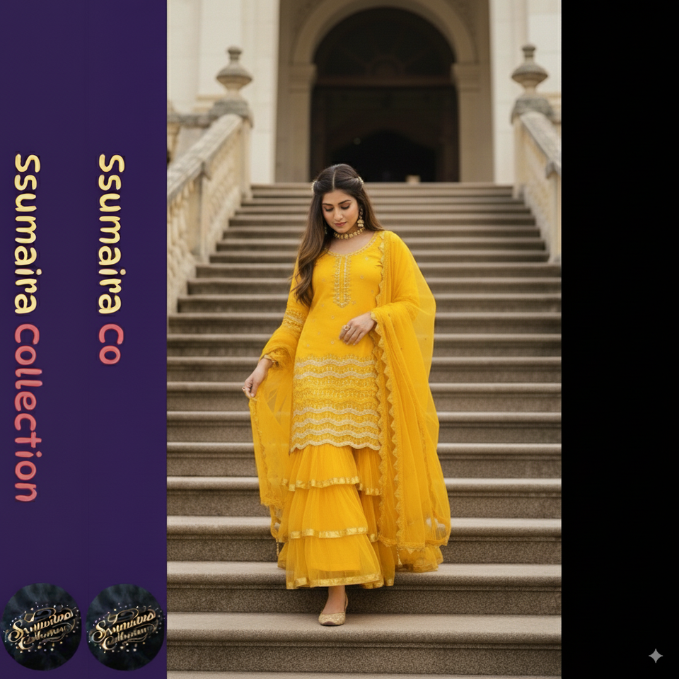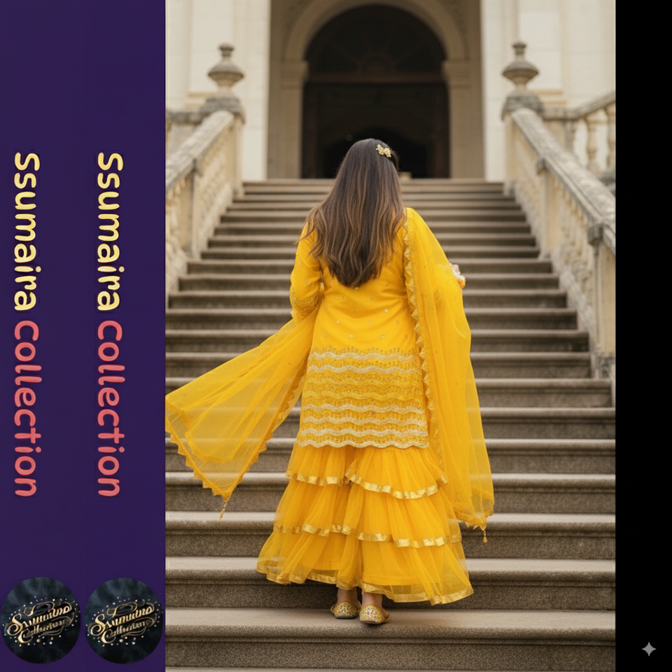 Vibrant Yellow Tiered Triple Flared Gharara Set | Festive Pakistani Mehndi & Haldi Outfit | Trendds by Cp