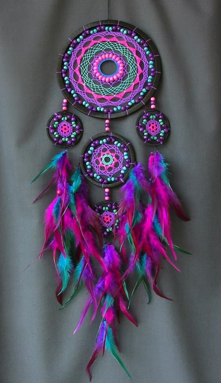 Vibrant neon pink teal and purple feather dreamcatcher bohemian macrame wall art available, at wholesale prices.