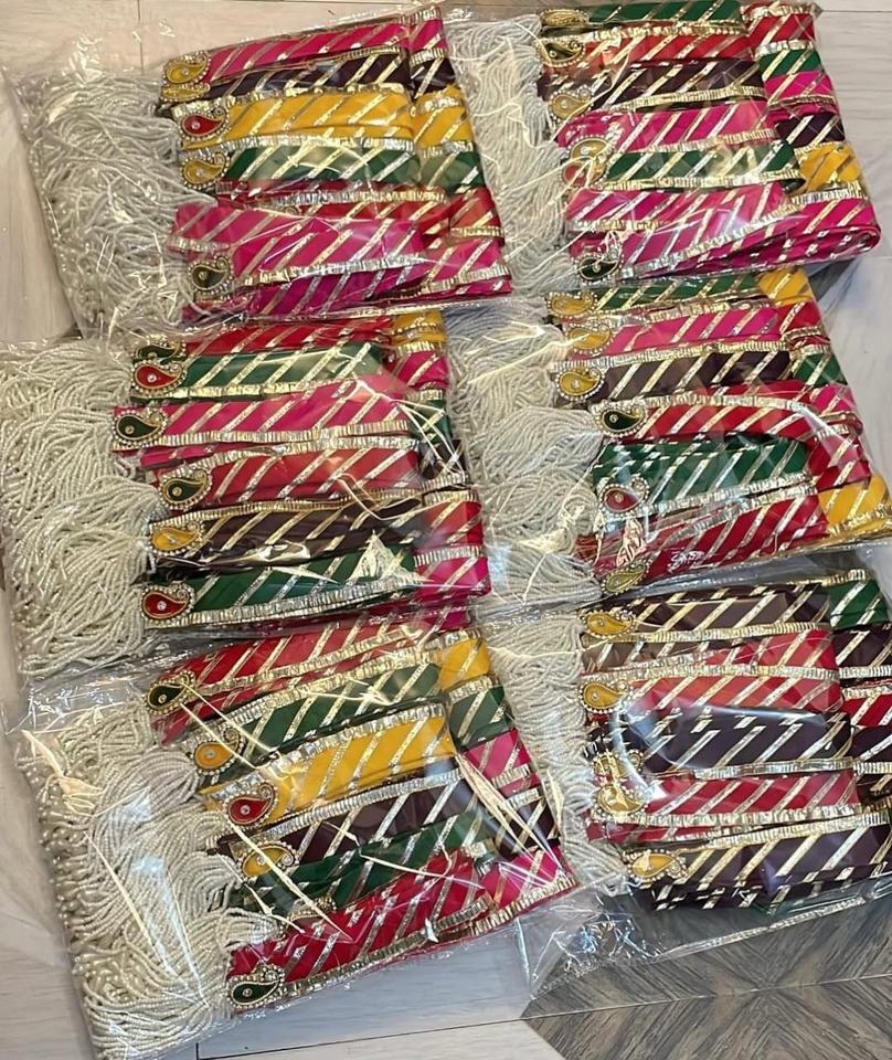 Vibrantly Crafted Traditional Rajasthani Gota Patti Leheriya Hair Accessories with Pearl Tassels diagonal stripe pattern