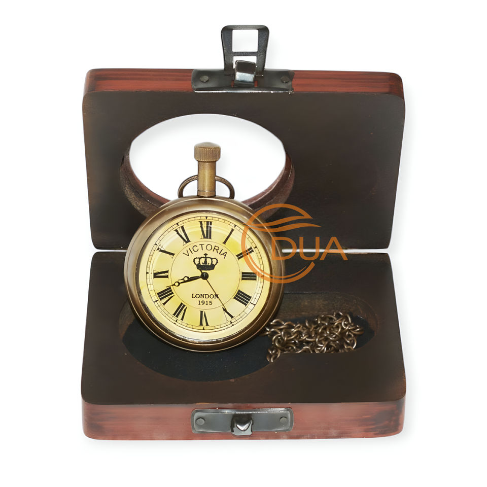 Victoria London 1915 Vintage Pocket Watch 1915 Antique Brass Roman Numerals Chain Quartz Movement Presented Wooden Display Box