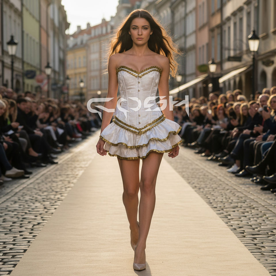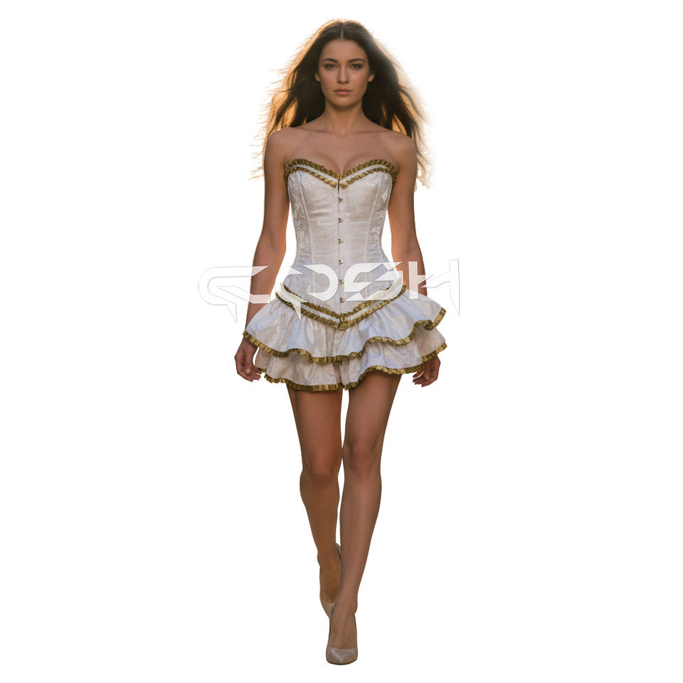 Victorian White Brocade Overbust Steel Boned Corset with Ruffled Gold Ribbon Trim