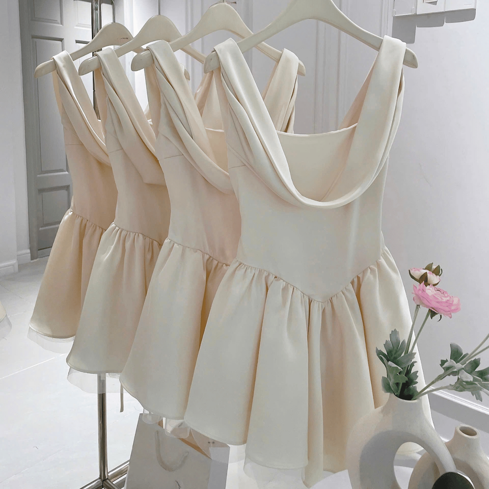 Vietnam Autumn Woven Women's Luxurious Mini Casual Dresses Natural Waist Solid Cowl Neck Sleeveless Slim Line Silk Sexy
