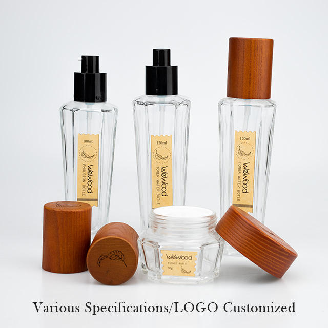 Vietnam Custom Logo Clear Pump Bottle Skin Care Set Face Cream Lotion Bottle Wooden Crown Cap for Packaging Screen Printing