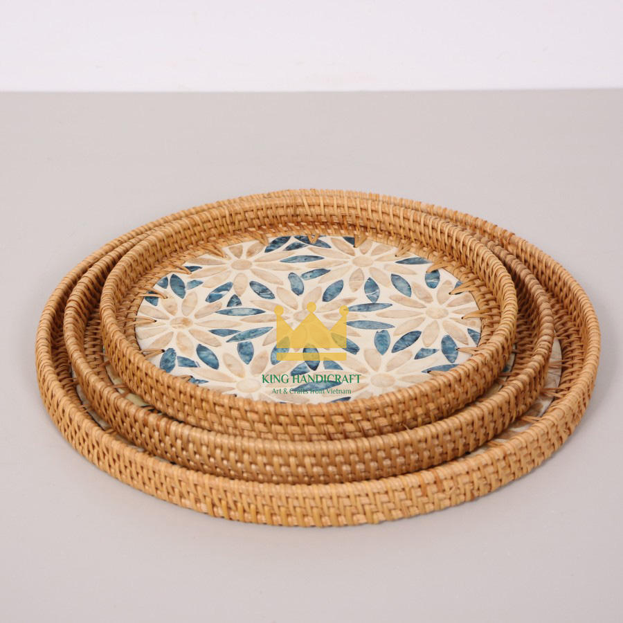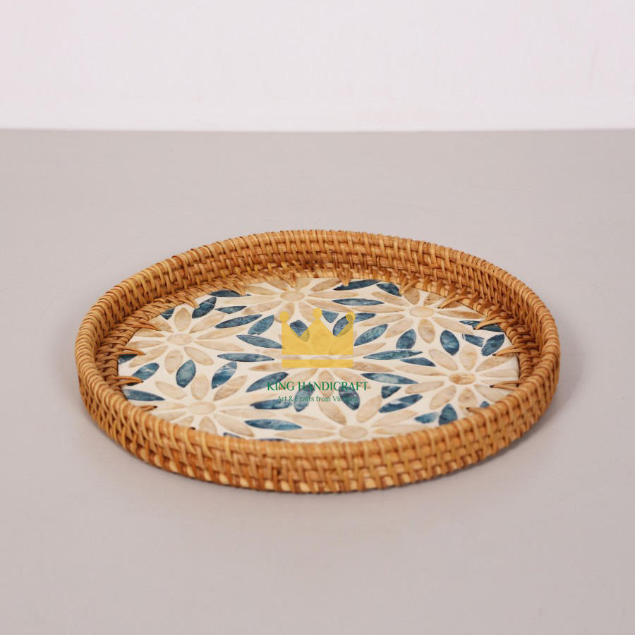 Vietnam Handmade Rattan Wicker Trays with Mother of Pearl Inlay MDF Base and Insert Handle for Fruit Serving