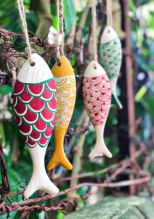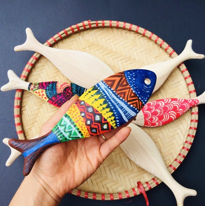 Vietnam Hanging Wooden Painted Fish Decoration, Wall Art Beach Decor Shell Art Maritime Gift for Home