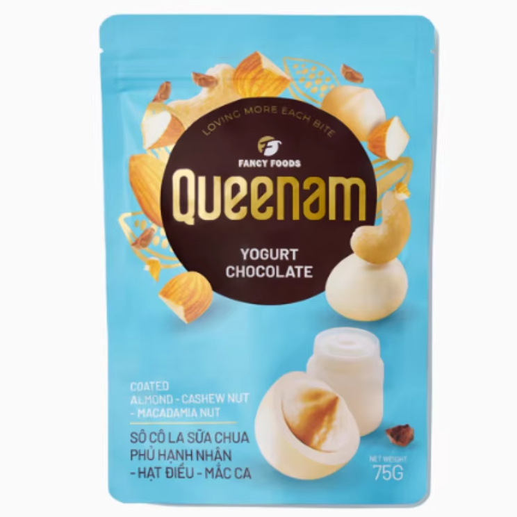 Vietnam Hot Sale OEM Halal Premium Yogurt Chocolate Flavor Solid Almond Cashew Macadamia Nut Dragee 75G Queenam Good Price