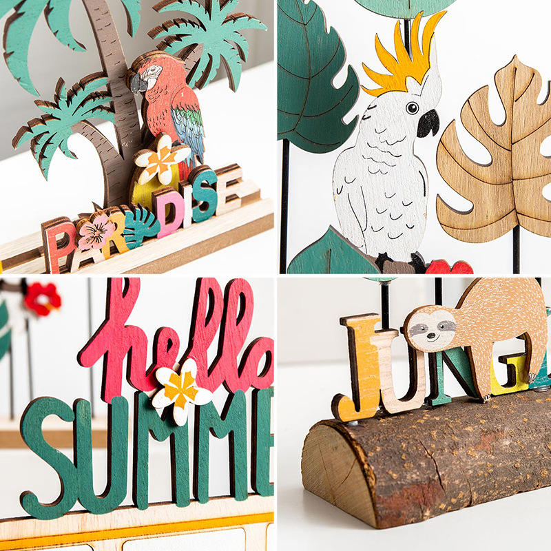 Vietnam Jungle Parrot Palm Tree Sloth Bus Wood Decor Set Wooden Ornaments for Summer Display