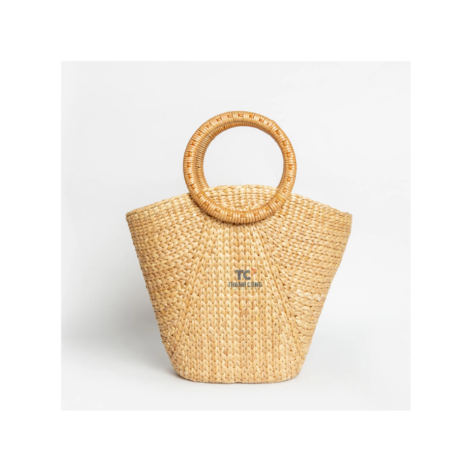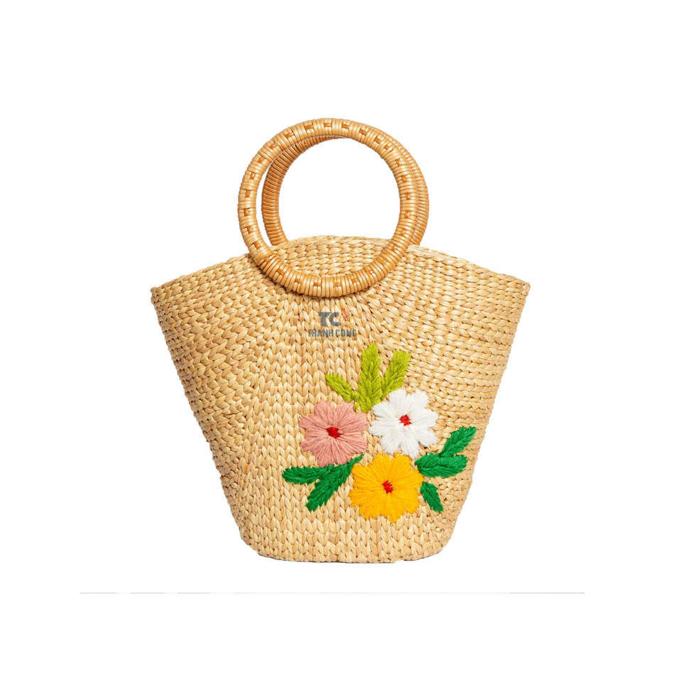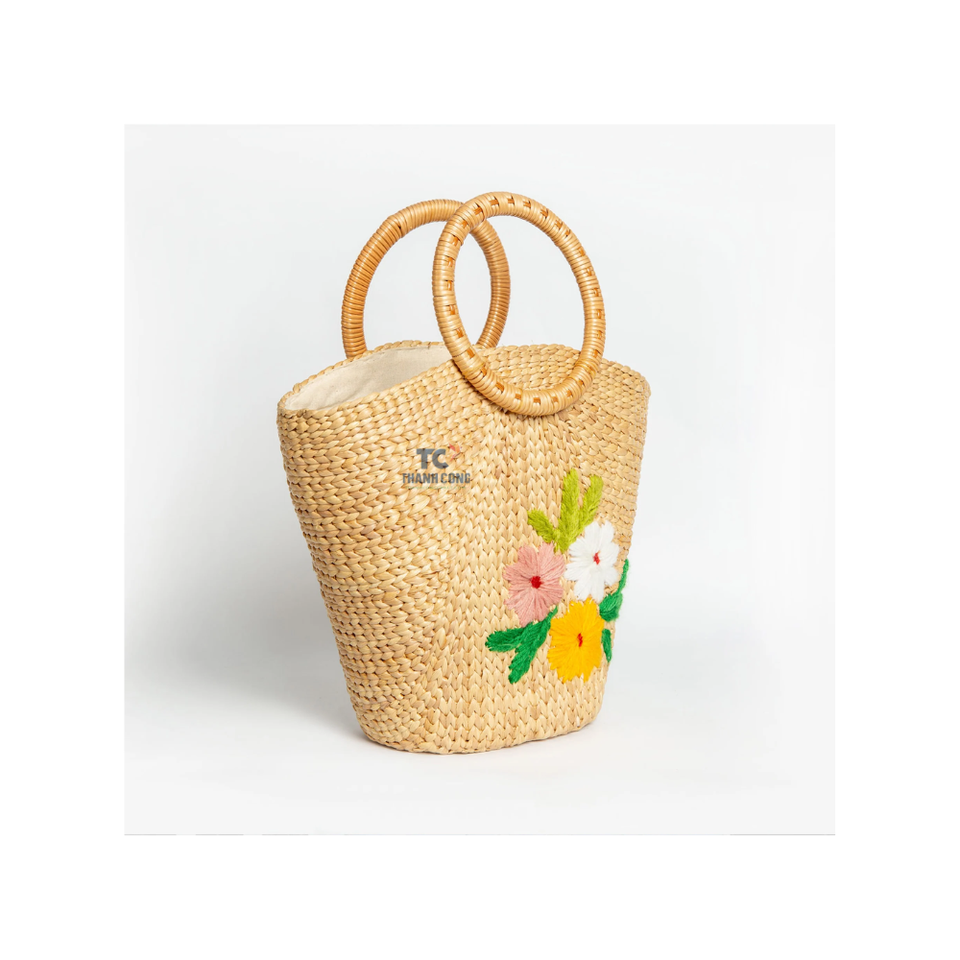 Vietnam Natural Water Hyacinth Seagrass Straw Tote Bag Handmade Embroidery Flowers Bohemian Style ZIP Closure Women's Handbag