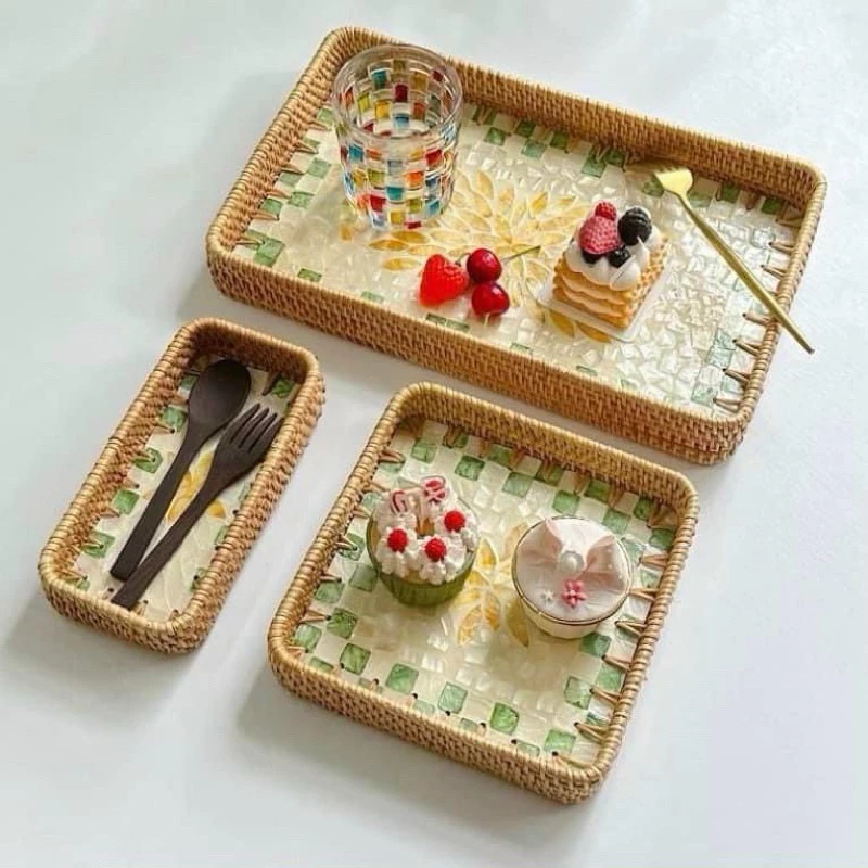 Vietnam Rectangular Rattan Lacquerware Tray - Handwoven with Mother of Pearl Inlay for Elegant Serving & Decoration