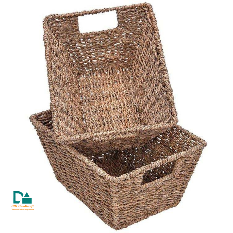 Vietnam Natural Seagrass Storage Basket with Lid & Handles Durable Woven Handicraft for Kitchen Wardrobe Clothing Home Decor