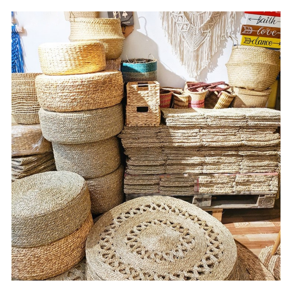 Vietnam-made water hyacinth cushion for tea table seating handwoven with soft structure and rustic natural fiber look