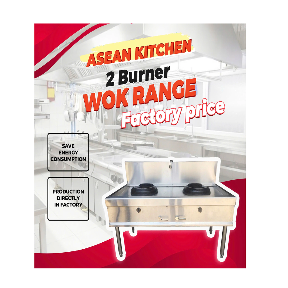 Vietnam's High Quality 304 Stainless Steel 1.0mm Thick 2-Burner Gas Wok Range Kitchen Appliance with 1-Year Warranty