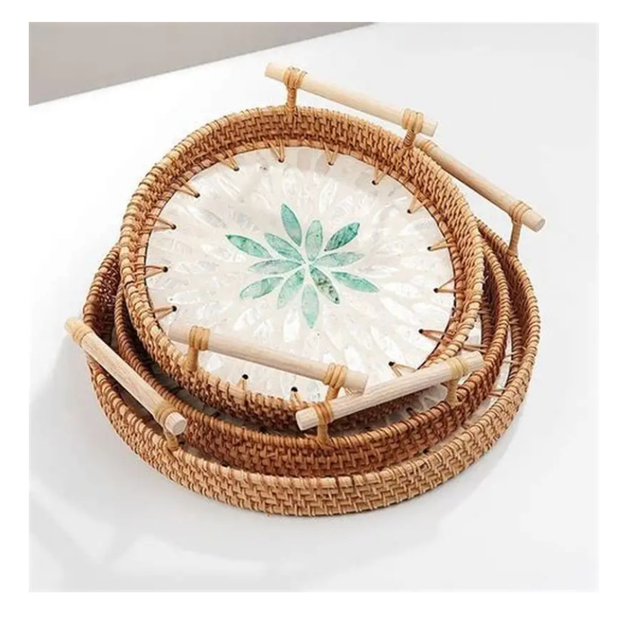 Vietnamese Pearl Inlaid Rattan Tray Eco Friendly Handwoven Tray for Home or Restaurant Use