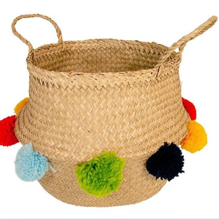 Vietnamese Seagrass Foldable Basket with Pom Poms Bao Minh TP567