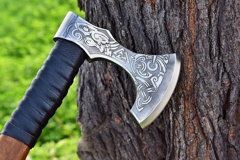 SCL- Hand Forged Viking Regular Long Handle Axe With Leather Warp. Etching Head Axe. Viking Axe For Camping Thomas Axe